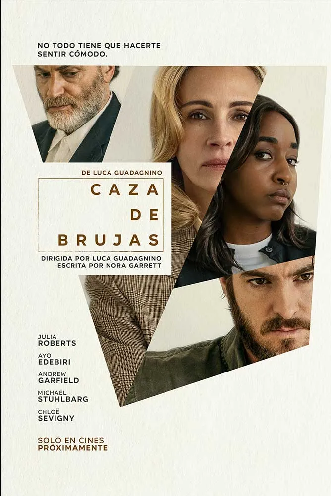 Del visionari cineasta Luca Guadagnino, ‘Caza de brujas’ és un apassionant drama psicològic sobre una professora universitària (Julia Roberts) que es troba en una cruïlla personal i professional quan una estudiant estrella (Ayo Edebiri) acusa un dels seus companys de treball (Andrew Garfield) i un fosc secret del seu passat pot sortir a la llum. ‘Caza de brujas’ està escrita per Nora Garrett.